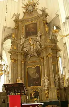 The high altar was built in 1721 by a Berlin craftsman, mainly from painted wood. The altar shows in three pictures; Bottom: " The Last Supper " ; Middle: " The Resurrection " ; Top: " The Effusion of the Holy Spirit " .