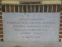 In 1954, the original building on the site, the novitiate, burned down. Following the fire, a series of developments were undertaken so that the property could continue as a novitiate and juniorate. The federalist style building became the novitiate and the building was extended to the south and east to house the juniorate. The new extensions were built from 1958 to 1960. When building commenced, the St. Stanislaus Novitiate was renamed and became Ignatius College. Included in the building was an extension that served as the chapel for the people there. In 1959, the partially completed building was opened by the Bishop of Hamilton, Joseph Francis Ryan.[4]
