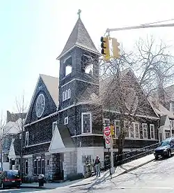St. Stephen's Methodist Church is a historic Methodist church located in the Marble Hill neighborhood of Bronx, New York City. The church was designed by architect Alexander McMillan Welch and built in 1897. It is a two-story, Shingle style church on a raised basement. It has a cross-gable roof topped by a small cupola, a rose window on the front facade, and features a pronounced bell tower with an open belfry and balconies. The interior is based on the Akron Plan. The church has an attached Sunday School wing with a hipped roof. Also on the property is the contributing two-story, Queen Anne style frame parsonage.[2]: 3, 6