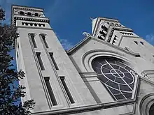 The new church was designed by James J. Egan of the firm of Egan & Prindeville, in the Romanesque Revival style with Gothic touches. The church is constructed of Indiana limestone and is considered representative of his best work. Its twin towers stand 140 feet tall.[3]