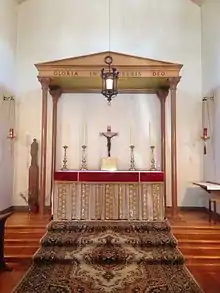 The chamber organ is registered with the National Trust.[63] It was built in Tasmania by Samuel Joscelyne in the 1860s and installed in the church in 1988[64] replacing a chamber organ, made by John Smith of Bristol, which had been sold to St Matthew's Bega in New South Wales. The Joscelyne organ has one manual and an octave pedal board with a range from G2 – G3 (rather than the more customary C2- C3). John Maidment (2007), of the Organ Historical Trust of Australia, has said that the "instrument is of interest for its superlative casework in Australian cedar (Toona Australis) and its outstanding craftsmanship. The casework is one of the largest surviving examples of 19th century Australian furniture and is notable for the excellence of its design; it has a splendid cornice, decorated with carved paterae, carved central cresting with scroll motifs in contrary motion, raised case panels and four flats containing dummy wooden "flatback" pipes covered in gold leaf and backed in red silk; the centre of each opening is surmounted by a carved curving rococo-style motif. The sides of the console opening have fretted inset panels while the large brass nameplate simply has "Joscelyne" engraved in copperplate script."[64]