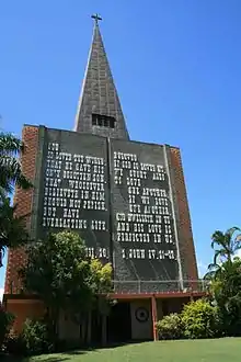 The place is important in demonstrating the principal characteristics and qualities of a Modernist church in Queensland. Highly intact, the building is a simple arrangement of forms and spaces using a restrained palette of fine quality materials and finishes. The church is notable for including a dominant bell tower, a large, well-lit nave focussed on an impressive sanctuary, a choir loft, a crying room, and a vestry.[1]
