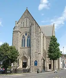 A Roman Catholic place of worship has existed at the bottom (west) end of Elm Grove since the late 1860s. Recent research has found that a temporary mission chapel, completed in 1869, stood on the site now occupied by St Joseph's.[2] (Older sources suggested that the building completed in that year was the first part of the present church structure.)[1][3][4] A local resident, Matthew Haddock, died in the 1870s; in his will he expressed a wish for a permanent church to be built to replace the mission chapel, and his wife donated £10,000 of bonds to fund this. Architect William Kedo Broder designed a tall stone building in accordance with Mrs Haddock's proposals, and the first part of the building—the sanctuary and part of the nave—was opened in May 1879.[2] In 1880 the sanctuary was enlarged and the apse was built. Before any more of Kedo Broder's designs could be realised, he was killed in January 1881, falling from a moving train.[2]