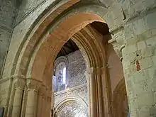 As originally built, the church had a tower and a nave, beyond which was a chancel with an apse and east-facing rounded chapels at the east end;[7] the outline of these can still be discerned.[5] Later in the 12th century (probably from the 1170s onwards)[5][9] everything beyond the nave was replaced with a tall, expansive quire with five bays, a quadripartite (four-celled) rib vault, aisles with their own vaulting, a triforium and a clerestory.[4][5][9] This work took several decades and was undertaken for William de Braose, 3rd Lord of Bramber, Philip de Braose's son.[8] Flying buttresses were added to the exterior to support the vaulted aisles soon after they were built—an early usage of this structural technique.[7]