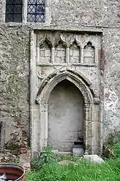 The short nave features a rubble walled windowless porch attached to the south side in the 19th century and a gabled west end rebuilt in the same century with a window of four lights in the 13th-century style. A two-lighted window on the north side is 13th-century and the two-lighted windows on the right and left sides of the porch are 14th- and 19th-century respectively. On the north side of the nave, a blocked-in doorway with a pointed arch surrounded by a carved rectangular architrave is 14th-century.[1]