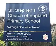 St Stephen's is a Voluntary Aided School, with 384 pupils in 2018, and an age range of 3 to 11 years, both girls and boys.[2] It is located on the Uxbridge Road in Shepherd's Bush, in the London Borough of Hammersmith and Fulham, England, at the junction with Coverdale Road, next to St Stephen's Church. Reflecting the diversity of the local area, 32% of pupils at the school do not have English as a first language, against a national average of 20.5%.[3] The ratio of students to teachers is 24.5:1, against a national average of 20.6:1.[3] 8.2% of students are given free school meals, against a national average of 24.9%.[3] The school embraces parent participation and even organises an annual Grandparents Day.[4]
