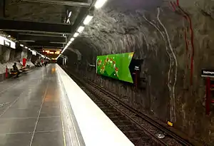 Stadshagen metro station is a station on the blue line of the Stockholm metro, located in the district of Stadshagen. The station was inaugurated on 31 August 1975 as part the first stretch of the Blue Line between T-Centralen and Hjulsta. The trains were running via Hallonbergen and Rinkeby.[2] The distance to Kungsträdgården is 3 km (1.9 mi).