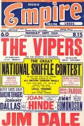 The contest took the form of a touring show that would visit theatres and concert halls in several major towns and cities in the United Kingdom.[4] Preliminary auditions for local amateur skiffle groups would be held on a Sunday.[4] Selected groups (usually five or six) would then compete in three weekday heats on Monday, Tuesday and Wednesday.[6] The semi-final would be held on Thursday and the final on Friday, with the winner decided by audience reaction.[6][4][7] This element was advantageous for acts with a large local following, but backfired on some dates when some acts "were so bad that the audience laughed their heads off", according to the New Musical Express.[8] The winning act would appear in the town's main Saturday presentation on a bill with professional acts.[6][4] They would also receive a £30 cash prize, with a promised advance to two semi-finals and a final with a £250 cash prize.[3][4] Dale believed parents would leave the shows with "a far better understanding of the noise the kids have been making in the kitchen or back yard".[5]