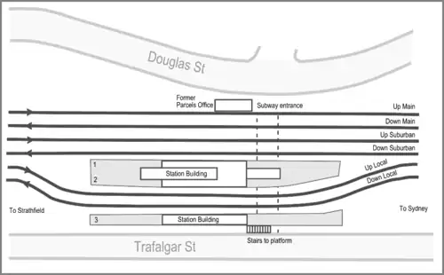 Stanmore Railway Station is entered from Trafalgar Street to the south and Douglas Street to the north via the pedestrian subway. The buildings are located at an important road intersection, with shopping precincts to both the north and south. The station group comprises a wayside platform with building, island platform with building, pedestrian subway, and parcel's office to the north. The current Inner West line uses the two southernmost tracks of the six tracks passing through the station.[2]