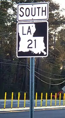 NotesSince 2008, La DOTD has been replacing the green-and-white state highway markers with a black-and-white version using the same design.[3] The new shields have a black background, white silhouette, black letters and numbers, and no frame outline (see photo below for comparison).