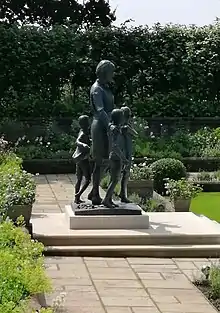 A statue of Diana, Princess of Wales is located in the Sunken Garden of London's Kensington Palace. Commissioned by Diana's two sons William and Harry on the 20th anniversary of her death, the statue was designed and executed by sculptor Ian Rank-Broadley and placed in the newly redesigned garden by Pip Morrison before being unveiled as a memorial to Diana on 1 July 2021, which would have been on her 60th birthday.[1]