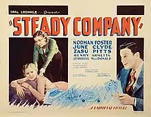 Steady Company is a 1932 pre-Code American action film directed by Edward Ludwig, written by Edward Ludwig and Earle Snell, and starring Norman Foster, June Clyde, ZaSu Pitts, Henry Armetta, J. Farrell MacDonald and Maurice Black. It was released on March 14, 1932, by Universal Pictures.[1][2][3]