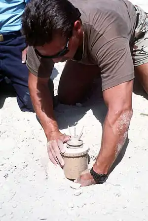 Soldier removing an Italian Valmara 69 anti-personnel bounding mine