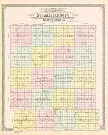 On July 13, 1883, the county organization was effected and Steele County was detached from Traill County; Sherbrooke, North Dakota was chosen as the county seat. In 1897 the town of Finley was founded, and by 1919 its growth had eclipsed Sherbrooke to the point that the county seat was transferred to Finley.[3] The county's boundaries have been unchanged since its creation.