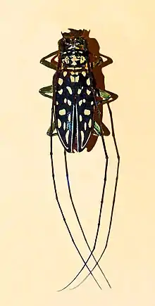Stellognatha maculata can reach a body length of 23–35 millimetres (0.91–1.38 in). The basic colour of these impressive long-horned beetles is blackish, with very long antennae and cream patches on the head, the prothorax and the elitra.