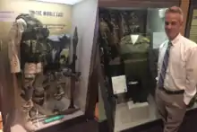 Congressman Steve Russell appearing with uniforms on loan to the Oklahoma History Center. The American uniform is one he wore during the hunt for Saddam Hussein and the green uniform was one worn by Saddam Hussein himself while President of Iraq. The uniforms are part of a special collection on display of Saddam related artifacts.