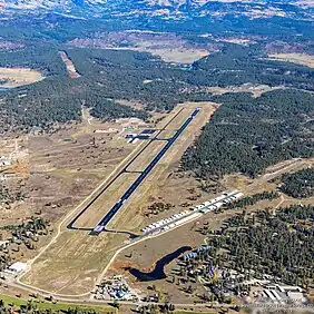 Stevens Field covers an area of approximately 328 acres (133 ha) at an elevation of 7,663 feet (2,336 m) above mean sea level. It has one runway designated 01/19 with an asphalt surface measuring 8,100 by 100 feet (2,469 by 30 m).[1] Due to the nature of the surrounding mountains and elevation, larger aircraft are generally advised to only depart from and land on runway 19 (e.g., heading south).