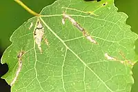 Its wingspan is 5–6 millimetres (0.20–0.24 in). The larvae mine the leaves of their host plant, which typically includes species of aspen including Populus alba, Populus canescens and Populus tremula.