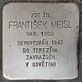 František Meisl, also Ferentz Meisel, was born on 17 August 1900 in Kolín. His parents were Albert Meisl and Růžena née Weisberger. He had two sisters and one brother: Gusta (born 1895), Anna (born 1897) and Pavel (born 1902). On 7 May 1942, he was deported from Prague to Theresienstadt concentration camp by transport At. His transport number was 337 of 1,001. Five weeks later, his mother, his sister Gusta and her husband arrived from Kolín. His other sister Anna and her husband had already been in Theresienstadt since February 1942. Step by step the whole family was torn apart and murdered. First the two sisters and their husbands were deported to extermination camps, one couple to Raasiku, the other to Treblinka. Then his mother died on 11 January 1943, then his aunt Hedvika on 6 December 1943. Twelve days later, on 18 December 1943, František Meisl was deported to Auschwitz concentration camp by transport Ds. His transport number was 614 of 2,503. He was murdered there by the Nazi regime.[37][38][39]