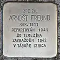 HERE LIVED ARNOŠT FREUND BORN 1911 DEPORTED 1941 TO THERESIENSTADT MURDERED 1942 IN CAMP IZBICA |