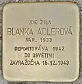 HERE LIVED BLANKA ADLEROVÁ BORN 1933 DEPORTED 1942 TO AUSCHWITZ MURDERED 15.12.1943 |