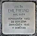 HERE LIVED EMIL FREUND BORN 1878 DEPORTED 1942 TO THERESIENSTADT MURDERED 1942 IN AUSCHWITZ |