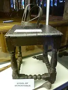 The stool of repentance (Scottish Gaelic: furm an aithreachais, stòl an aithreachais),[1][2] in Presbyterian polity, mostly in Scotland, was an elevated seat in a church used for the public penance of persons who had offended against the morality of the time, often through fornication and adultery. At the end of the service the offender usually had to stand upon the stool to receive the rebuke of the minister. It was in use until the early 19th century.