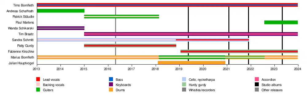 - Fabienne "Fabi" Kirschke – hurdy-gurdy, recorders, backing and lead vocals (2019–present)