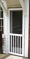 A storm door is a type of door that is installed in front of an exterior access door to protect it from bad weather and allow ventilation. Storm doors generally have interchangeable glass panels and window screen panels to provide visibility and prevent flying insects from entering the home.