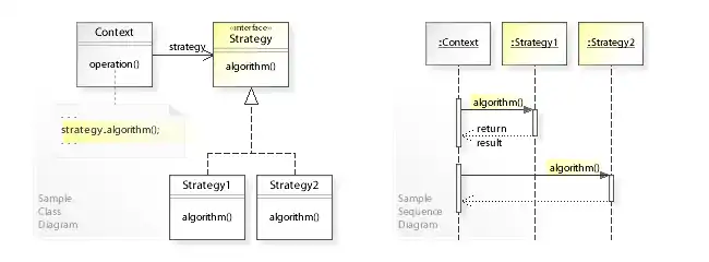 In the above UML class diagram, the Context class doesn't implement an algorithm directly. Instead, Context refers to the Strategy interface for performing an algorithm (strategy.algorithm()), which makes Context independent of how an algorithm is implemented. The Strategy1 and Strategy2 classes implement the Strategy interface, that is, implement (encapsulate) an algorithm.
