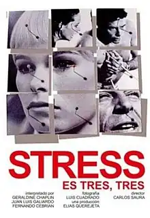 Stress Is Three (Original title: Stress-es tres-tres) is a 1968 Spanish drama film directed by Carlos Saura. The film stars Geraldine Chaplin and Fernando Cebrián as a troubled married couple. Their marital problems are partially a consequence of Spain's rapidly modernizing consumer society.[1] Saura explains that his film is "the study of the crisis in a seemingly developed society, the crisis of the modern Spaniard who, underneath the new veneer, is still a medieval man, who still has working within him the old taboos and moral repressions from his religious past."[2] The film is experimental in nature, whereby Saura moved away from several of the formulas of his previous two films, Peppermint Frappé and La caza. Saura noted, "At the root of it, I had the sense that in Peppermint Frappé I was very constrained by story and I wanted to unbind myself. So, I made Stress Is Three, Three as a kind of liberation."[3]