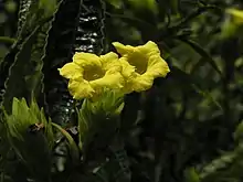 Strobilanthes crispa is a shrub which originated from Madagascar,[2] and is now found across south east Asia.[3] It is a member of the family Acanthaceae.[2] It is known as pokok pecah kaca or pokok pecah beling in Malaysia,[2] and pecah beling, enyoh kilo, kecibeling or kejibeling in Indonesia. The leaves are used traditionally for treatment of cancer and diabetes,[2] usually taken as a tea or infusion of the leaves.[3]