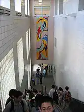 The blocks are set into the hallway walls and scattered throughout the building. Each block is inscribed with a brief description of its contents or context. The items displayed include a section of the Great Wall of China, fragments of the Mayan pyramids, leaves from the sacred Bo tree, water from the Nile and Ganges Rivers, a Revolutionary War button, pieces of the 15th Street Stuyvesant building, a report card of a student who studied in the old building, and fragments of monuments from around the world, various chemical compounds, and memorabilia from each of the 88 years' history of the 15th Street building. Empty blocks were also installed to be filled with items chosen by each of the graduating classes up through 2080.[60] The installation received the Award for Excellence in Design from the Art Commission of the City of New York.[61]
