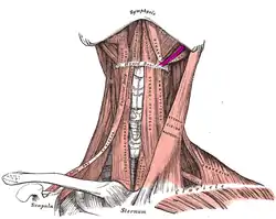 ![]() Muscles of the neck. Anterior view. Stylohyoid muscle in purple | |