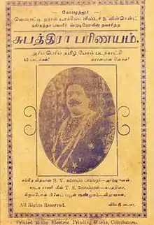 Subhadra Parinayam is a 1935 Indian Tamil language film produced by Samikannu Vincent and directed by Profulla Ghosh. The film featured S. V. Subbaiah Bhagavathar and T. S. Velammal in the lead roles while the comedy track featured Buffoon Shanmugam, Karaikudi Ganesha Iyer and others.[2]