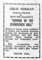 Norman felt the play flopped in the US due to unfamiliarity with Australian slang.[10] He said two versions of certain scenes were made, one for American audiences the other for Australian audiences. For instance, American scenes would refer to "dames" while Australian ones who refer to "sheilas". "In this way we hope to make the film a success in both countries," said Norman, who arrived in Australia on 9 December 1958.[17]