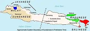 The Sundanese are of Austronesian origins and are thought to have originated in Taiwan. They migrated through the Philippines and reached Java between 1,500 BC and 1,000 BC.[4] Nevertheless, there is also a hypothesis that argues that the Austronesian ancestors of contemporary Sundanese people originally came from Sundaland, a massive sunken peninsula that today forms the Java Sea, the Malacca and Sunda Straits and the islands between them.[5] According to a recent genetic study, Sundanese, together with Javanese and Balinese, has almost an equal ratio of genetic marker shared between Austronesian and Austroasiatic ancestries.[6]