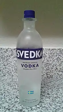Svedka is a mid-priced[1] brand of vodka owned by New York–based Constellation Brands. The product name is a portmanteau of the words Sverige or svensk ("Sweden" and "Swedish" respectively in the Swedish language) and "vodka". The spirit is unaged 40% alcohol (80 proof). A one-liter (35 imp fl oz; 34 U.S. fl oz) bottle is produced using about 1.5 kg (3.3 lb) of wheat and spring water. Svedka is bottled unflavored, and in citron, cherry, clementine, raspberry, vanilla, blue raspberry, and piña colada flavors.