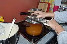 Spätzle is prepared by scraping the fresh pasta down in thin bands from the "Spätzlesbrett" (a simple wooden board), but nowadays there are special "Spätzlepresse"s available, (which are similar to potato ricers). Shorter Spätzle and the thick, round Knöpfle are prepared with a Spätzlehobel, which is a board with little holes through which the dough is pushed, directly into the boiling water.