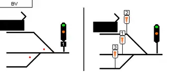 An illuminated numeric display is used to indicate which track is concerned by the signal, track 1 always being the one closest to the station building. Trains standing on other tracks know that this signal implies the 'halt' aspect for their tracks. 'Track free' indicators are also used which indicate which aspect applies to track where the indicator is installed. In this example, the driver knows that the signal with aspect 2 permits him to start.