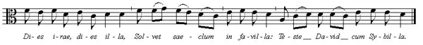 As commentators have pointed out,[4] the first four notes of which match the Dies Irae chant, part of the Latin mass for the dead: