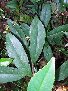 Leaf venation is easily noticed, particularly on the underside. Net veins are not clearly evident above the leaf, better seen under the leaf. The paler coloured midrib is sunken on the top leaf surface, and raised under the leaf. The leaf stalk is 10 to 15 mm long, flattened on the top side and but rounded underneath.