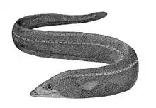 The shortdorsal cutthroat eel (Synaphobranchus brevidorsalis, also known commonly as the shortfin cut-throat eel[2]) is an eel in the family Synaphobranchidae (cutthroat eels).[3] It was described by Albert Günther in 1887.[4] It is a marine, deep water-dwelling eel which is known from the Indo-Pacific and western central Atlantic Ocean, including Zanzibar, Maldives, Australia, Japan, Suriname, and the Gulf of Mexico. It dwells at a depth range of 900 to 3,000 metres (3,000 to 9,800 ft), most often between 1,000 to 2,500 metres (3,300 to 8,200 ft), and leads a benthic lifestyle, inhabiting the continental slope. Males can reach a maximum total length of 111 centimetres (44 in).[3]