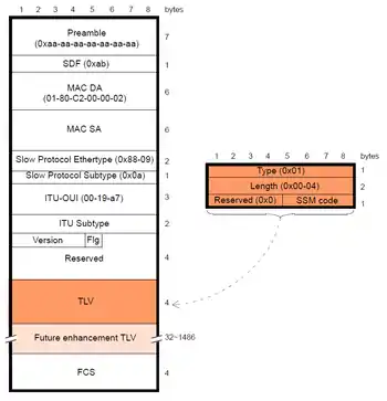 The ESMC protocol is composed of the standard Ethernet header for a slow protocol, an ITU-T specific header, a flag field and a type length value (TLV) structure. The SSM encoded within the TLV is a four-bit field whose meaning is described in ITU-T G.781.