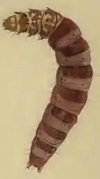 The wingspan is 10–13 mm.[2] The forewings are bronzy-black, somewhat lighter basally; a nearly straight narrow white fascia beyond middle. Hindwings are fuscous, darker posteriorly. Under-surface with white fascia distinct across forewings and forming a costal spot on hindwings. The larva is pale ochreous-yellowish; 3-12 with broad dull red transverse bands, on 3 and 4 somewhat interrupted; head yellow-brown; plate of 2 yellow-brown, posteriorly blackish-marked [3]