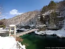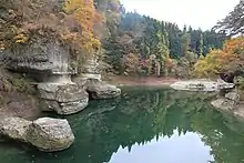 The area was designated a natural monument in 1943 as a unique example of terrain formed during the Pleistocene epoch.[2] The cliff sides were carved out by the Agano River (known as the Ōkawa River in Fukushima Prefecture) over hundreds of years.