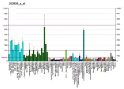 ACK1 or TNK2 has been shown to interact with AKT,[7] Androgen receptor or AR,[10] a tumor suppressor WWOX,[11] FYN[12] and Grb2.[13][14] ACK1 interaction with its substrates resulted in their phosphorylation at specific tyrosine residues. ACK1 has been shown to directly phosphorylate AKT at tyrosine 176, AR at Tyrosine 267 and 363, and WWOX at tyrosine 287 residues, respectively. ACK1-AR signaling has also been reported to regulate ATM levels,[15]