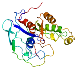 Activated CDC42 kinase 1, also known as ACK1, is an enzyme that in humans is encoded by the TNK2 gene. [5][6][7][8][9] TNK2 gene encodes a non-receptor tyrosine kinase, ACK1, that binds to multiple receptor tyrosine kinases e.g. EGFR, MERTK, AXL, HER2 and insulin receptor (IR). ACK1 also interacts with Cdc42Hs in its GTP-bound form and inhibits both the intrinsic and GTPase-activating protein (GAP)-stimulated GTPase activity of Cdc42Hs. This binding is mediated by a unique sequence of 47 amino acids C-terminal to an SH3 domain. The protein may be involved in a regulatory mechanism that sustains the GTP-bound active form of Cdc42Hs and which is directly linked to a tyrosine phosphorylation signal transduction pathway. Several alternatively spliced transcript variants have been identified from this gene, but the full-length nature of only two transcript variants has been determined.[9]