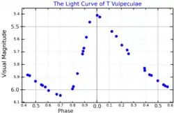 A well-studied Classical Cepheid variable and one of the brightest known,[12] the apparent magnitude of T Vulpeculae ranges from 5.41 to 6.09[4] over a period of 4.435 days.[3] It is a yellow-white hued supergiant of spectral type F5 Ib.[5] The variability of T Vul was discovered in 1885 by Edwin Sawyer.[13] Observations between 1885 and 2003 shows a small but continuous decrease in the period of variability amounting to 0.25 seconds per year.[14]