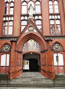 Church portal with Jesus statue by Julius Wucherer (1905-copy after Thorvaldsen)